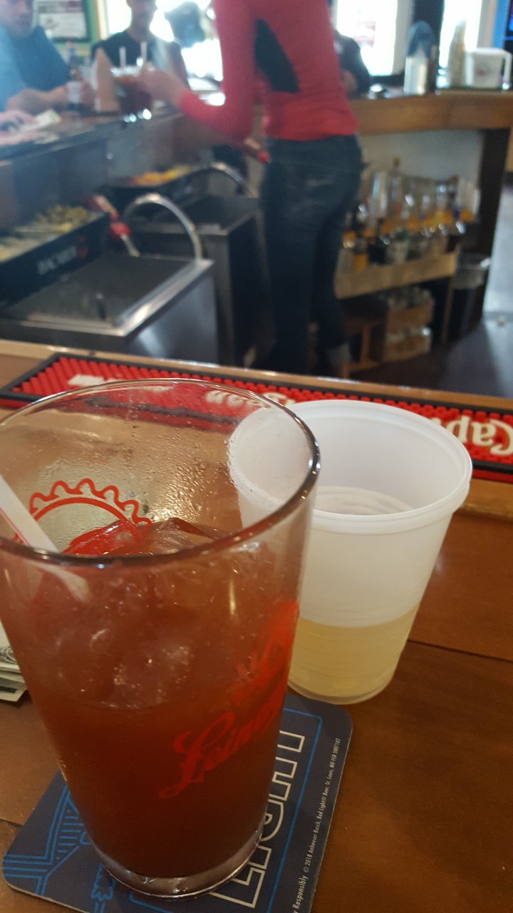 Crispy chicken cutlet over mashed potatoes with a lemon butter cream sauce. That was mine. It was good. I wouldn't get it again tho.