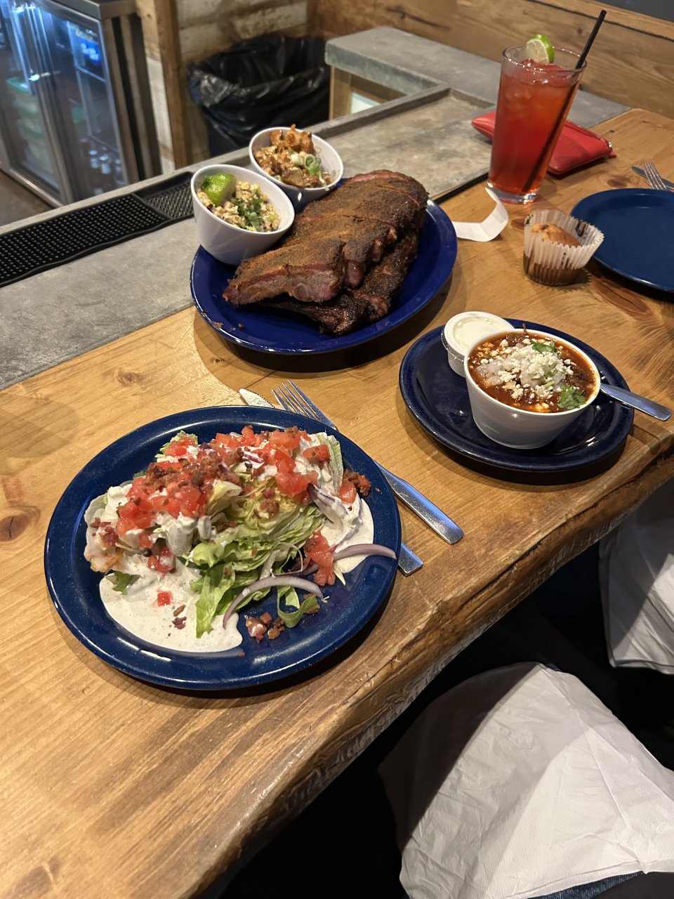 Wedge salad, chili con Mac, fried Potato salad, elotes (Mexican corn) and smoked ribs.