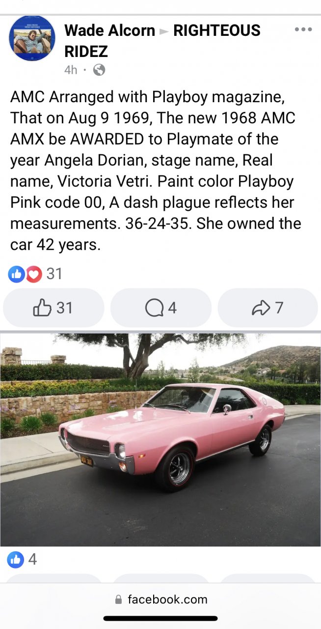 I figured that car, a clean AMX 1 owner with a Bunny history has to be worth quite a bit. “She owned the car for 43 years.” Why sell it now? Does she have family?