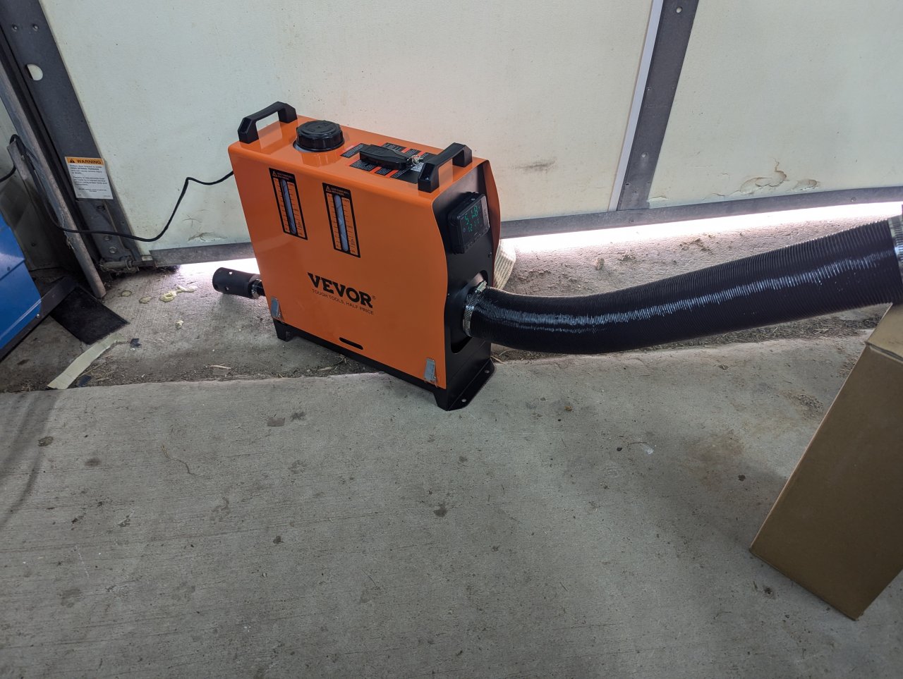 The one problem with that, is you might experience some icing/gelling of the fuel feed if there was sufficient cold blowing air coming under that door crack. Maybe extend that exhaust tubing so it goes under the door, but the rest of the unit should come up higher...like maybe on a welding cart or...Harbor Freight Service Cart...and it'll even match the Vevor color.