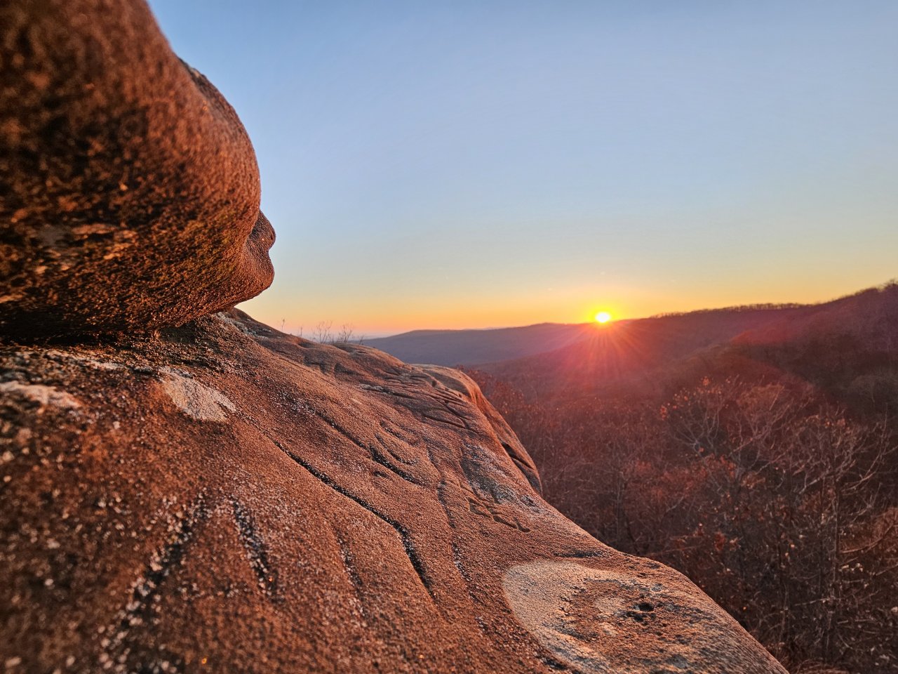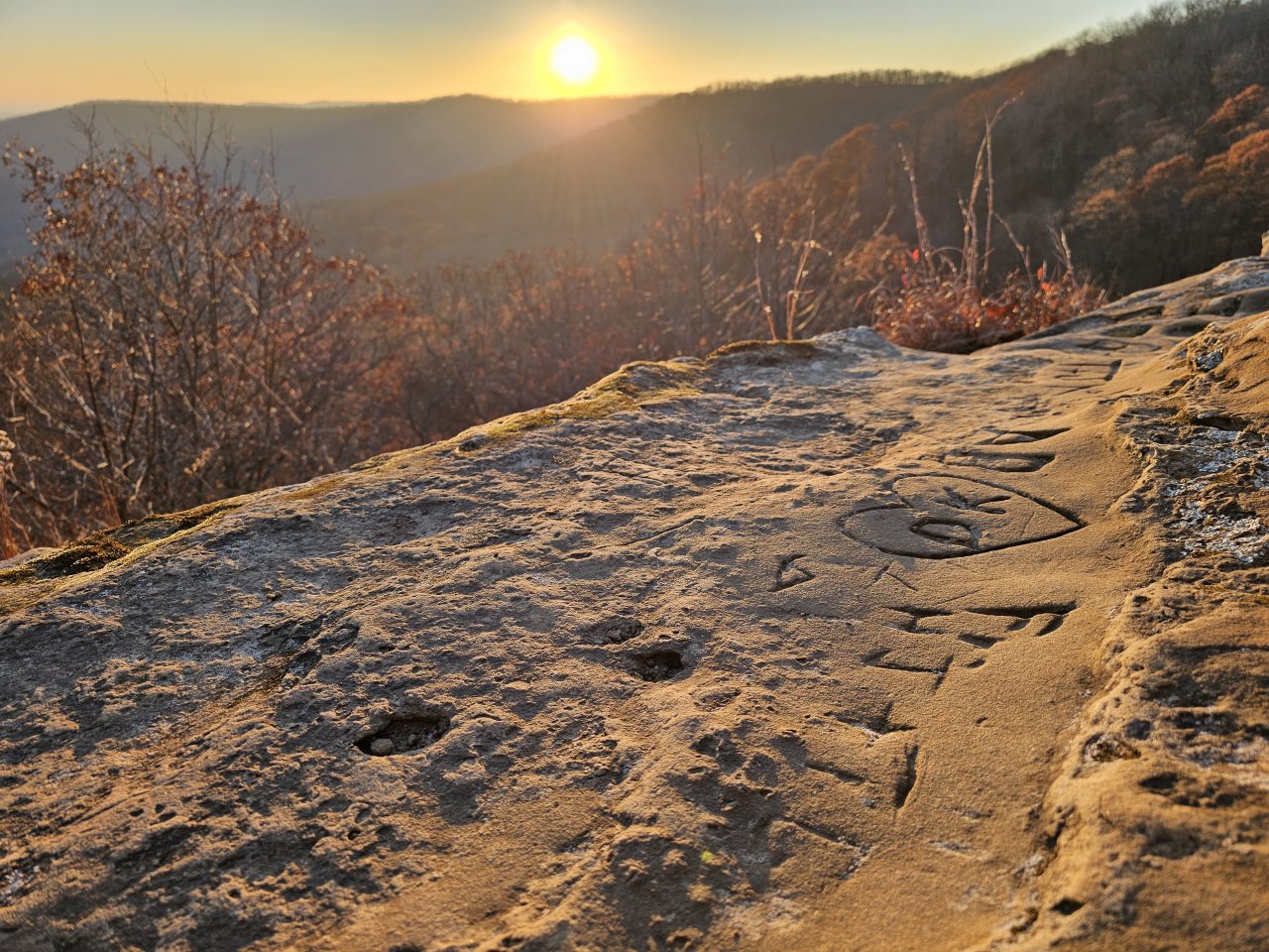 Prett good representation of the Ozarks. Sunset pics from a place called Hanging Rock. Folks been scratchin their name in there for 200 years.