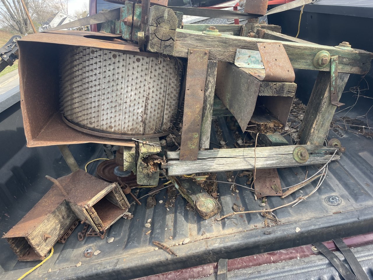 Self feeding rollers spring loaded to control the feed rate, have no idea what the drum with the spikes is removing or separating.