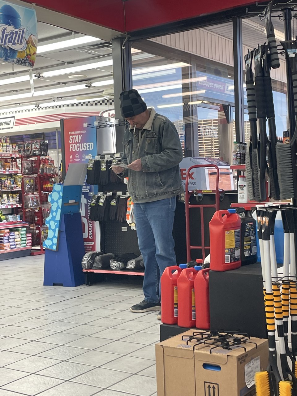 Grayson, Ky. Stopped to check my axle weights after installing a new leveling valve and t to throw some groceries down my neck. Kept smelling a cigarette while I was eating then seen this guy walk close by. They still have ashtrays here on the tables….