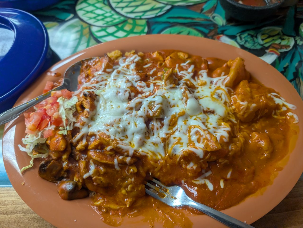 A bed of rice, chicken, mushrooms and cauliflower in a red chile sauce. I thought it was good but apparently I'm in the minority.beastr123, JolliRoger, ElmerFudpucker and 14 others Thank this. -