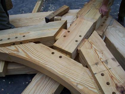 All of the wood pieces are prefit and drilled in the shop for the oak dowels. This structure has been assembled once, in small units at the shop before it is sanded, oiled and sent out for the final raising.