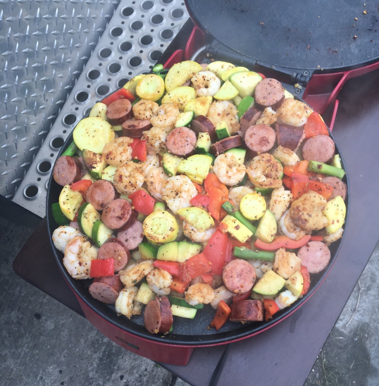Sausage, shrimp, squash, zucchini, asparagus, red bell peppers, and spicy Montreal seasoning in place of cajun seasoning.Logan76, Hurricane69, BigBob410 and 17 others Thank this. -