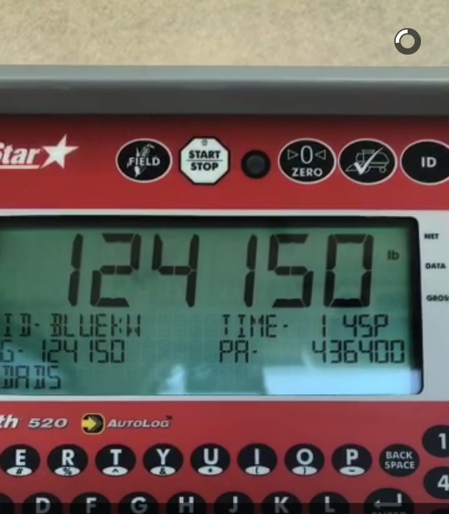 Here's the most weight we have ever got in the cart the other day on spring wheat. It was also flashing over capacity. So that be about 2070 bushels.