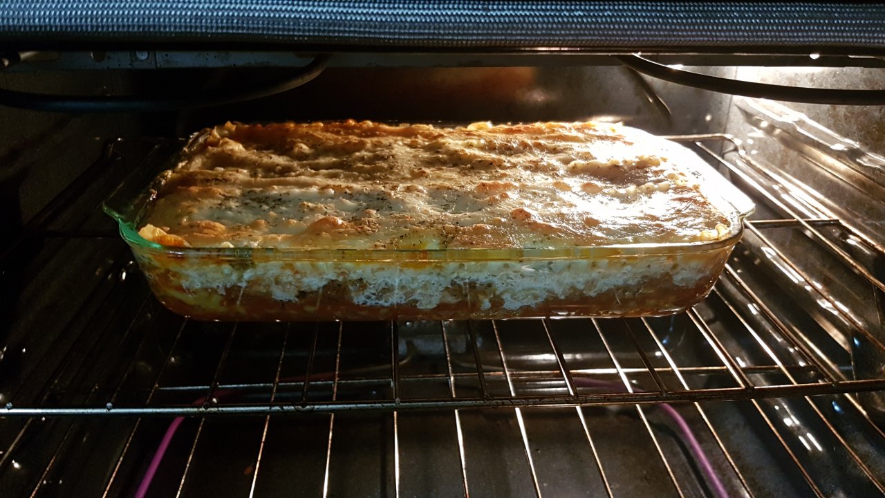 Thin layer of sauce on the bottom to keep everything from sticking, followed by a layer of lasagna noodles. Then ground beef, sauce and 3 garlic cloves. More noodles and then a mix of cottage cheese, egg, hot peppers and diced mushrooms. Noodles again and then Montery Jack Jalapeno cheese. Just waiting for it to cool.