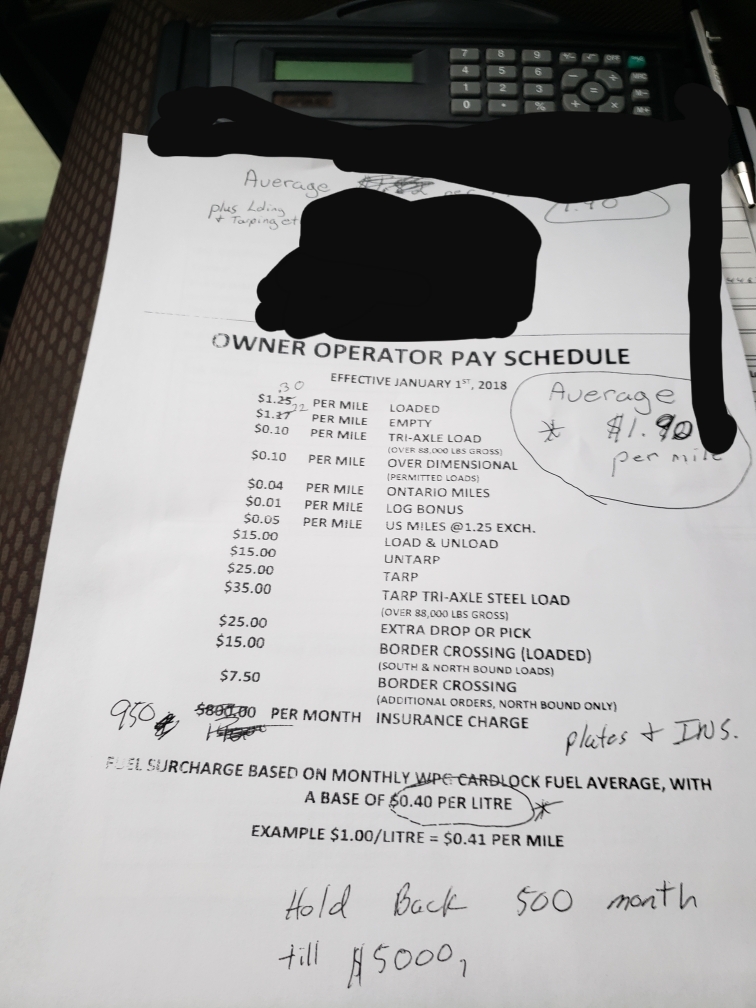 I can already tell the fuel surcharge bit is a scam. The truck should make 100% of it. It works out to about $1216 CAD a day in the US (based on the 1.90 a mile at 640 miles in a day), and that's only a slight bit short of what most of you guys want at $1000 US. But with how I know stuff works with loading and unloading in Ontario, there are days you are making 100-150 miles plus $50.