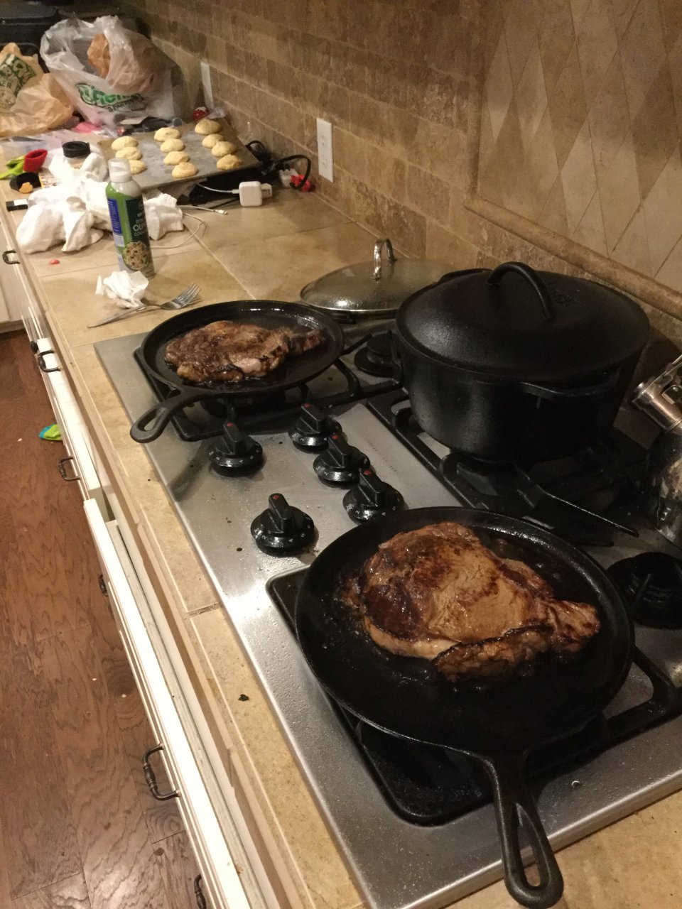 My fault, Skooler. I should have put a trigger warning. Dual flat iron skillets cookin ribeyes:thumbup:
