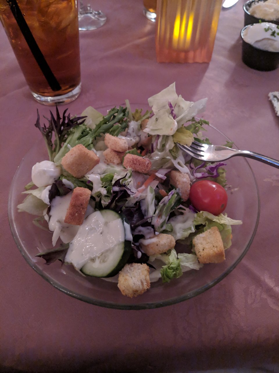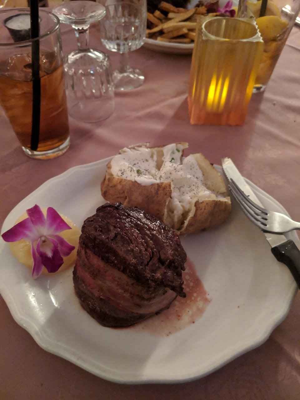 I ordered the filet mignon...petite cut and it was still 4" thick and 5-6" round. I forgot to get a pic of the appetizer tray and french onion soup that came before the salad.