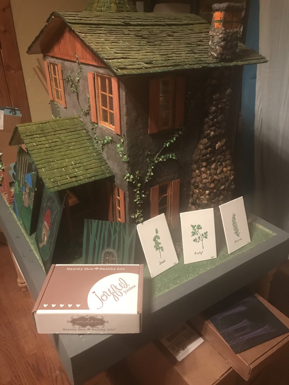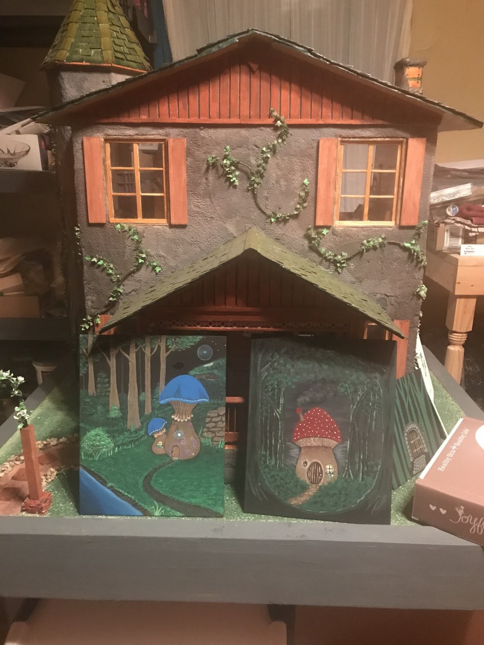 Propped up against a miniature house she built - complete with furniture - ALL from scratch- her OCD at full creative capacity.
