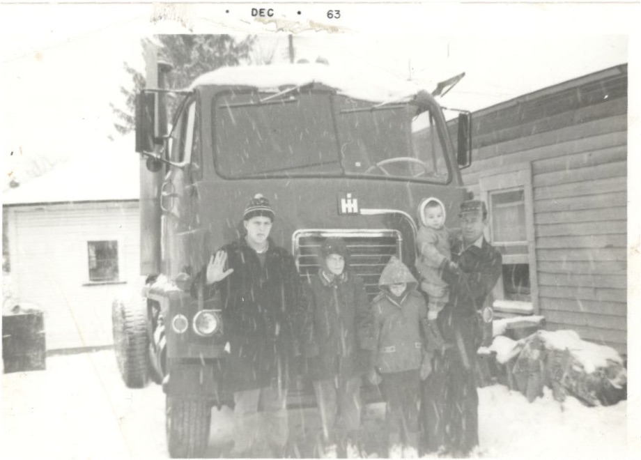 1963 IH Grandpa John on the right and Dad waving to camera. Not sure on the year of truck.