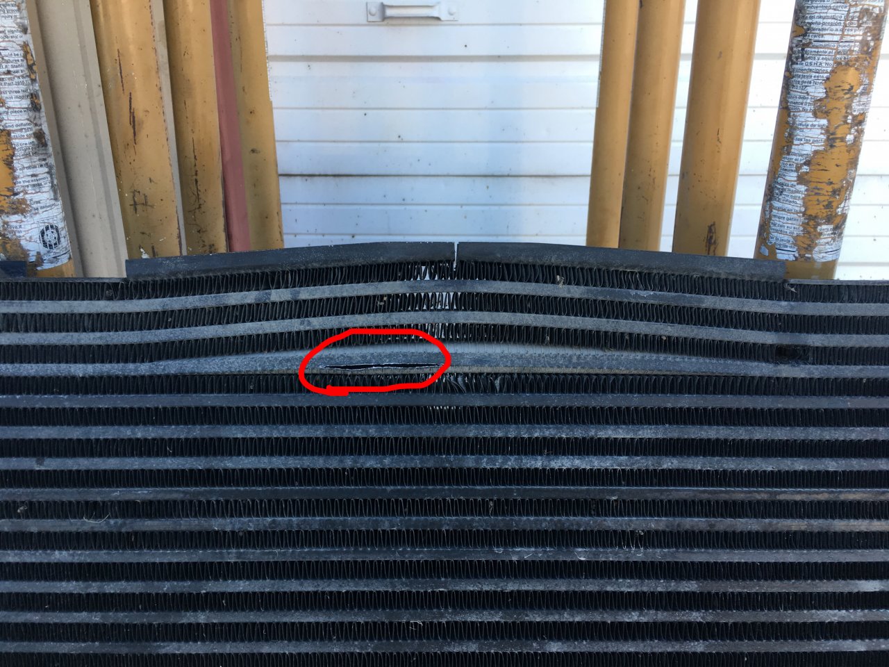 I had one do the same thing on it's very first trip in July '06. I'm not sure if it's a mounting issue or if Behr, who makes them for Paccar, is using too thin of material for the dimensions of the T800 WH CAC. The core size alone is 48"w X 32"h, so it's darn big.