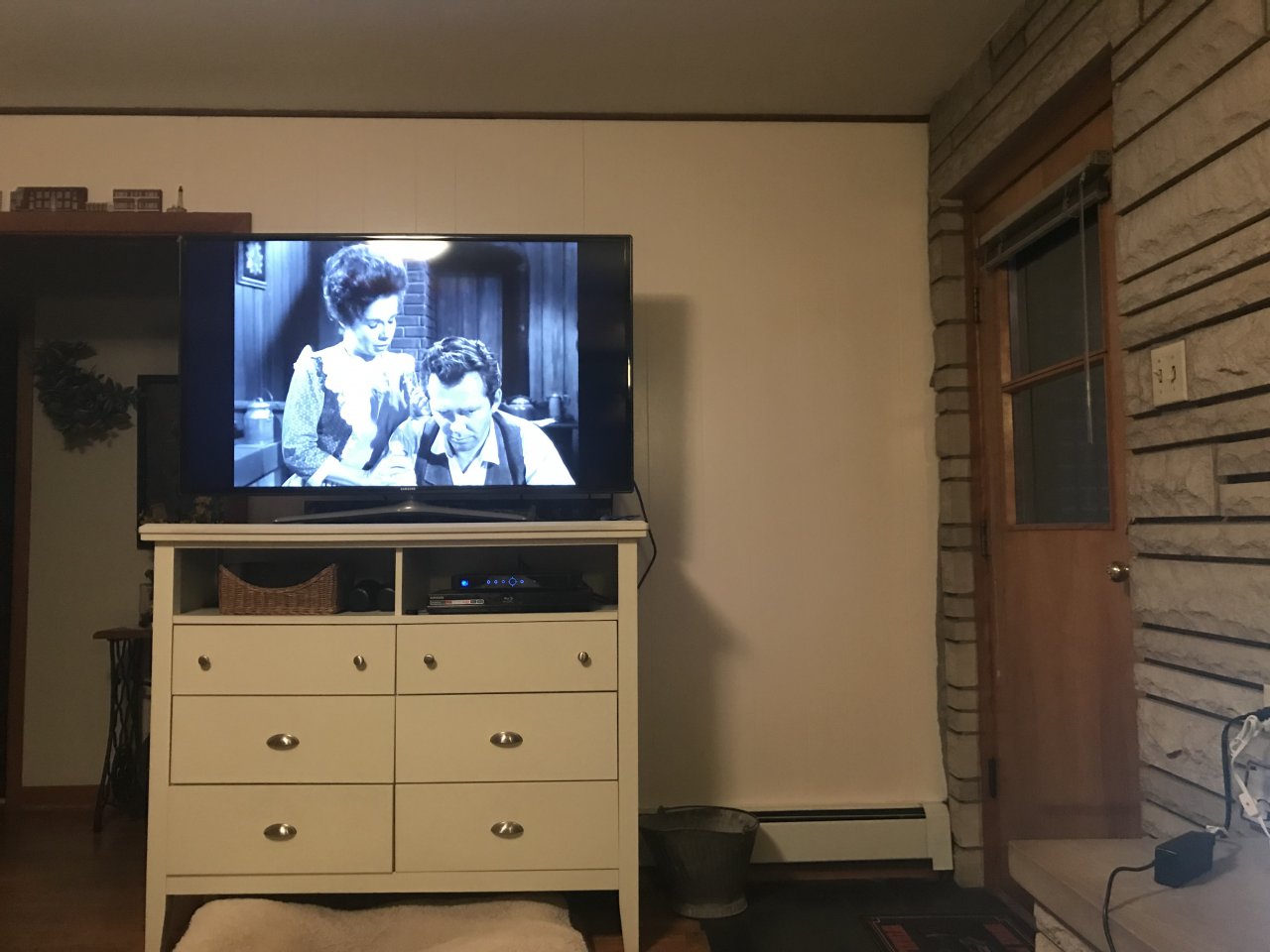 Singer? sewing machine and a coal bucket in the living room, I like it.