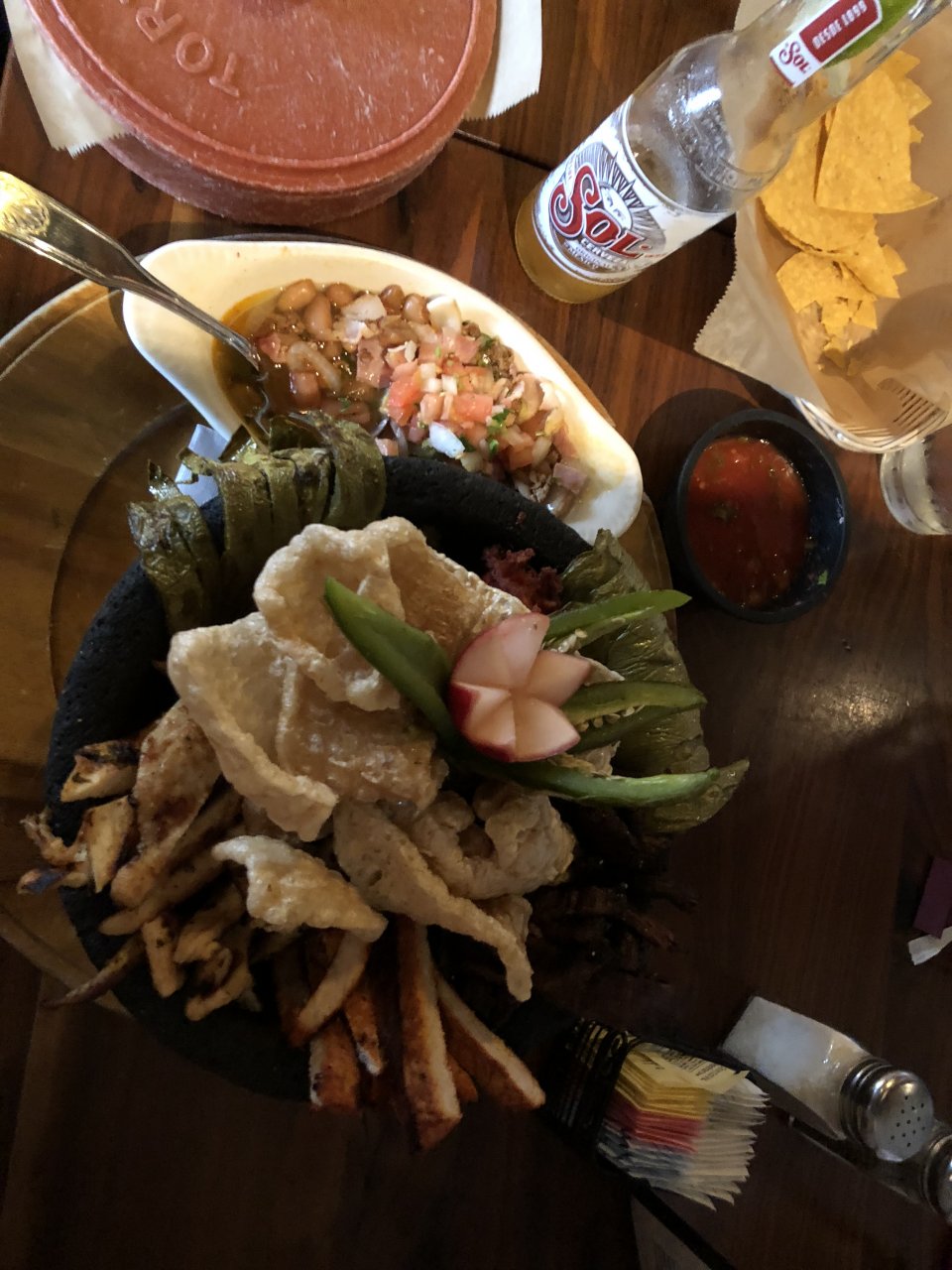 Stone bowl of melted spiced cheese with poblano seeds, a roasted split poblano, sliced roasted cactus, steak, chicken, pork, with a radish and pork skins on top, side of beans w spiced pepper, tomato, pork belly, and onion.