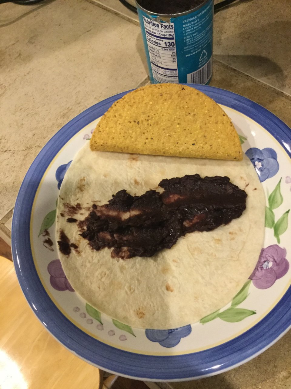 Take a corn shell out of the oven after 5 minutes. Put some refried beans down to act as the glue.