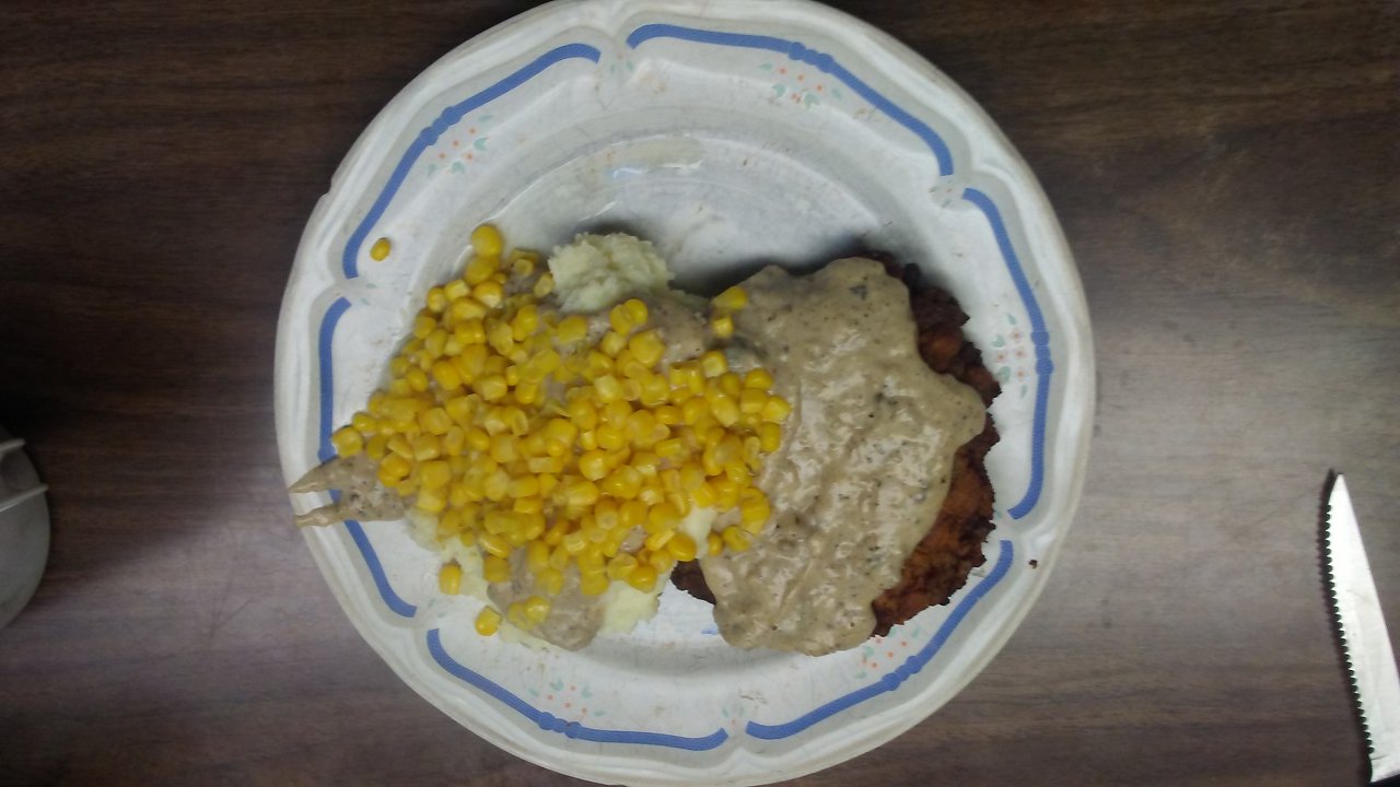 Chicken fried steak, garlic dirty mashed potatoes, corn and gravy.