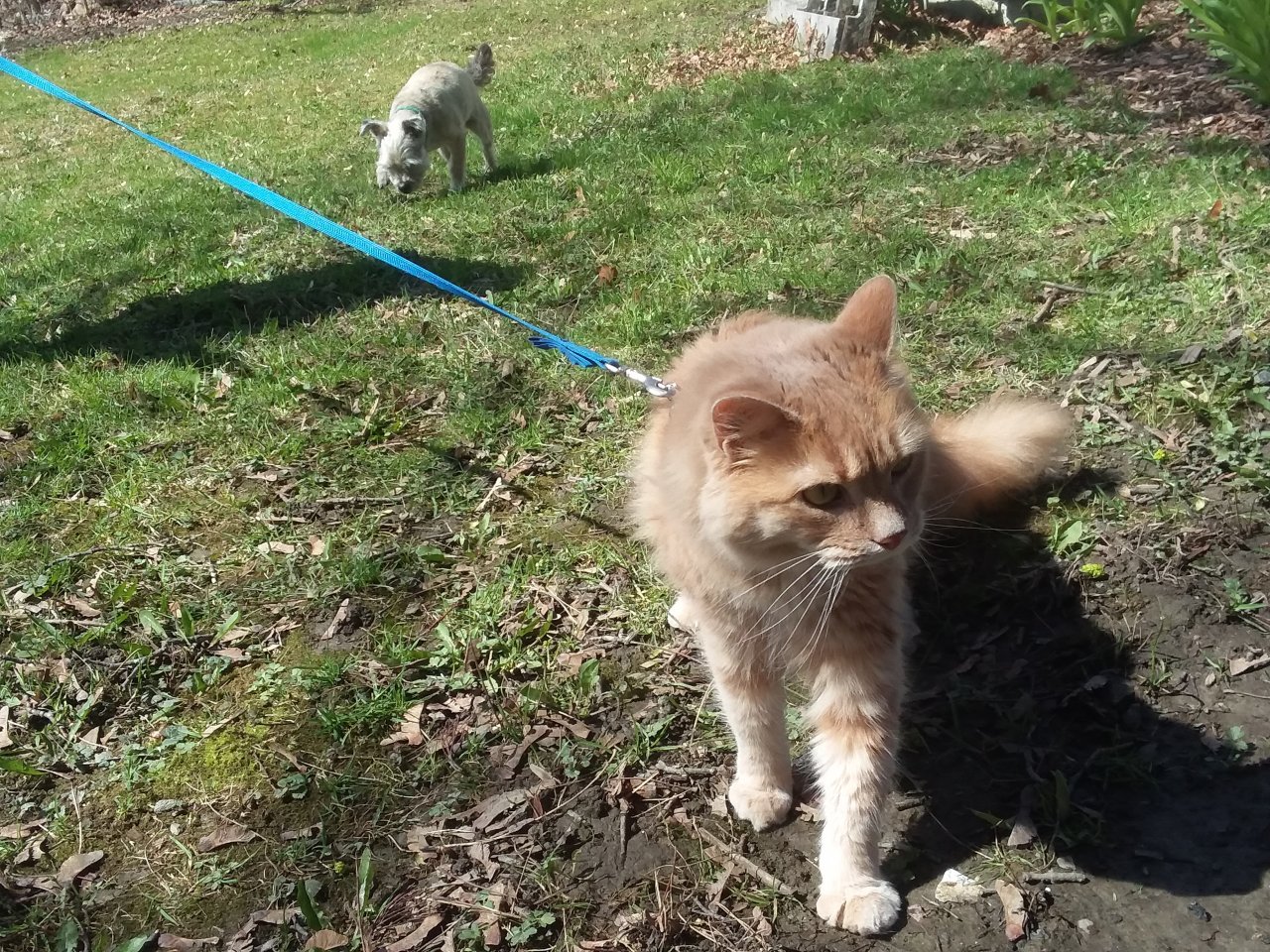 Good, my wife isn't the only one who puts the cat on a leash. Fleabag, I mean my wife's cat, has a dog cable in the front yard so he won't wander off. Makes for some good entertainment sometimes.