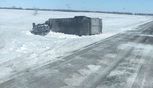 It was a windy one today and roads were crappy in spots throughout ND. A friend sent me this pic earlier. I don't know any more details but I'm guessing with the roads being icy and a strong side wind it blew him off the road.
