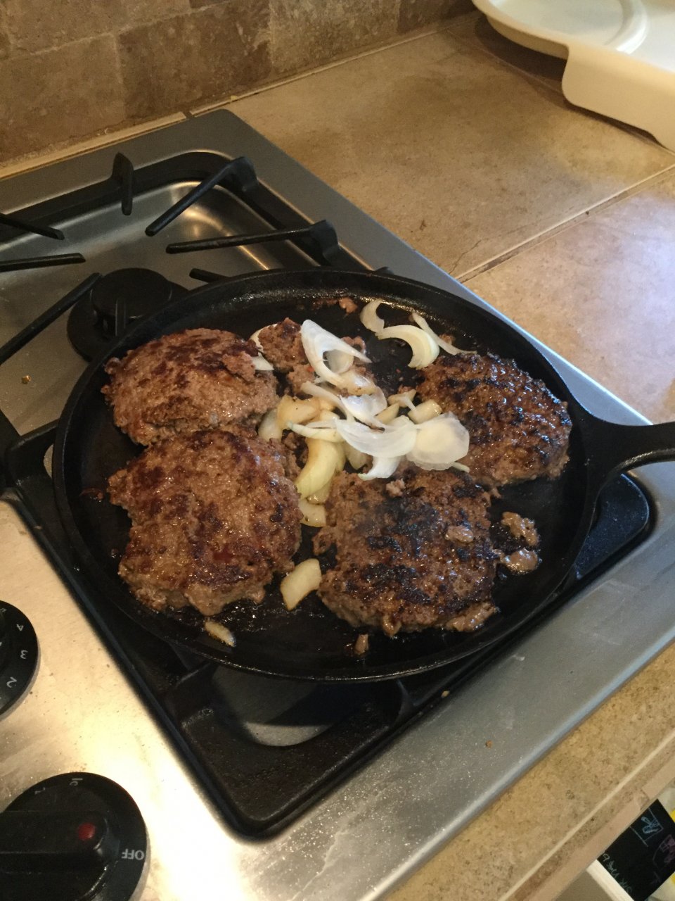 Now we’re cooking with propane boys! Hamburgers on a flat iron skillet, some onion to throw in the greasy mix