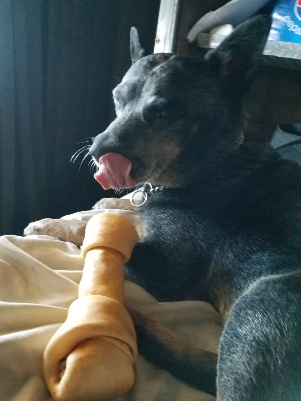 If he’s anything like mine, he’ll chew that thing up and leave little white pieces of slobbery mush all over the bed.