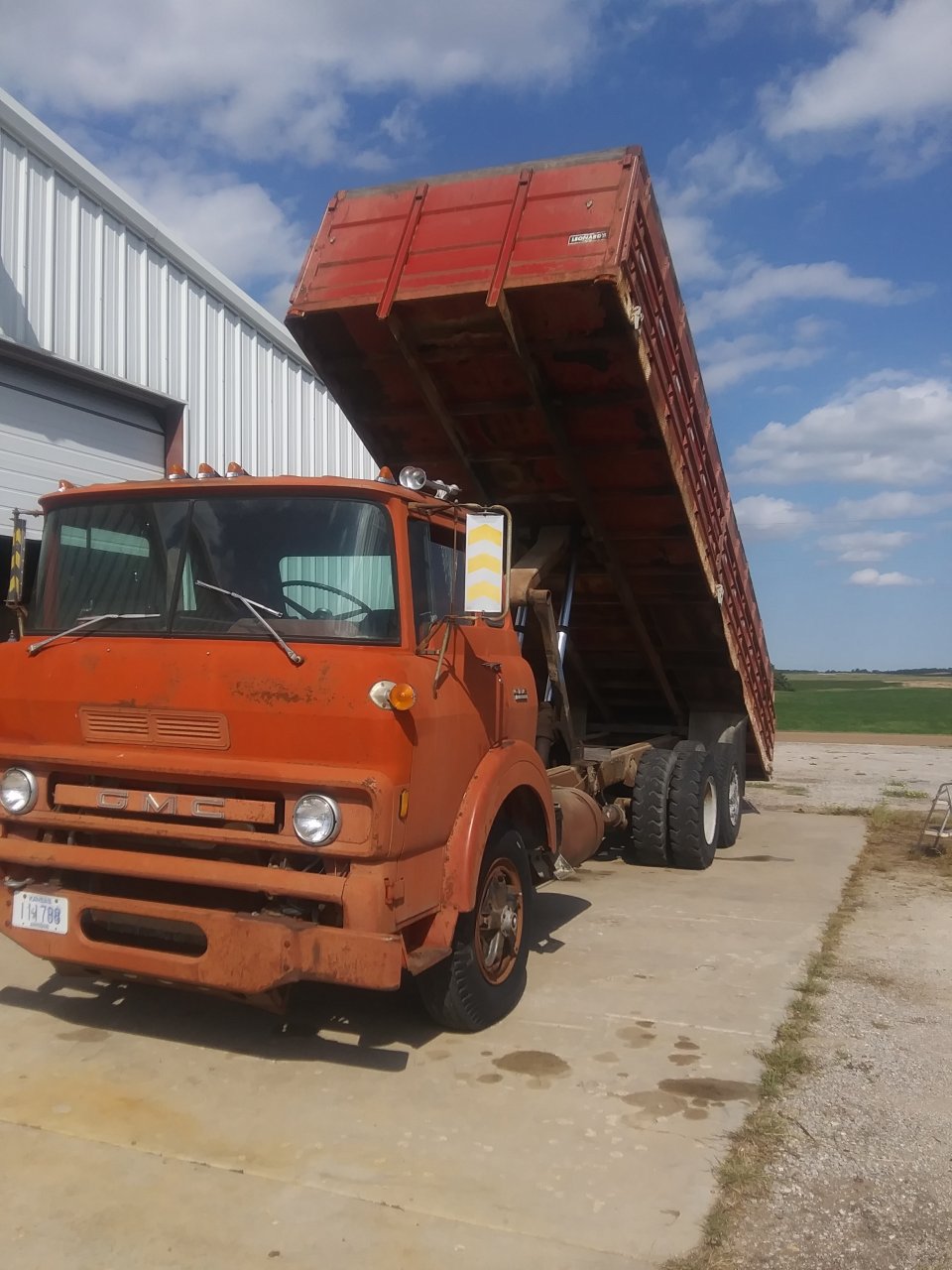 Hey 51. Might consider cutting off 4 or 5 ft of the rear of bed. Is that all the farther up it raises? Or does the bed hit the ground first. That doesn't look like enough of an angle for dirt to slide out unless maybe you weld some sheets if steel to the floor.
