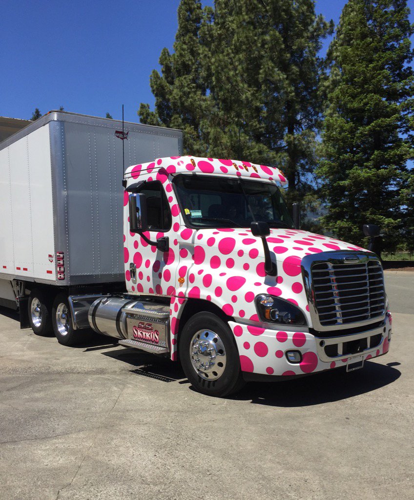There is a small regional company in Northern California named Skikos Trucking. All of their trucks are some strange shade of pink or purple, but this one takes the cake. They haul mostly wine up and down the west coast.