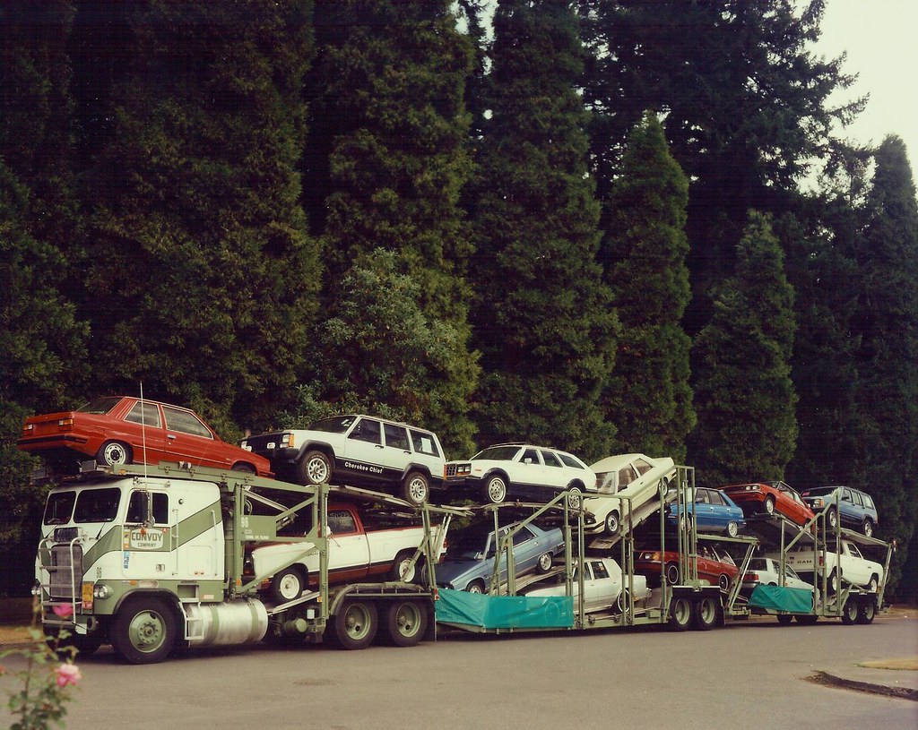 Hauling a bunch of Chrysler vehicles,mostly AMC/Jeep/Eagle,(Jeep Cherokee XJs,a Eagle wagon)with some Renault Alliance/Encore coupes/hatchbacks,a couple of Dodge Ram regular cab pickups,a Dodge Aries/Plymouth Reliant K wagon and sedan, and either a Chrysler Imperial or New Yorker sedan or Dodge Diplomat or Dynasty.Last edited: Jan 22, 2023