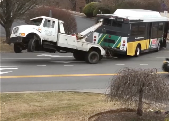 Wrecker driver has a heck of a time trying to tow a bus