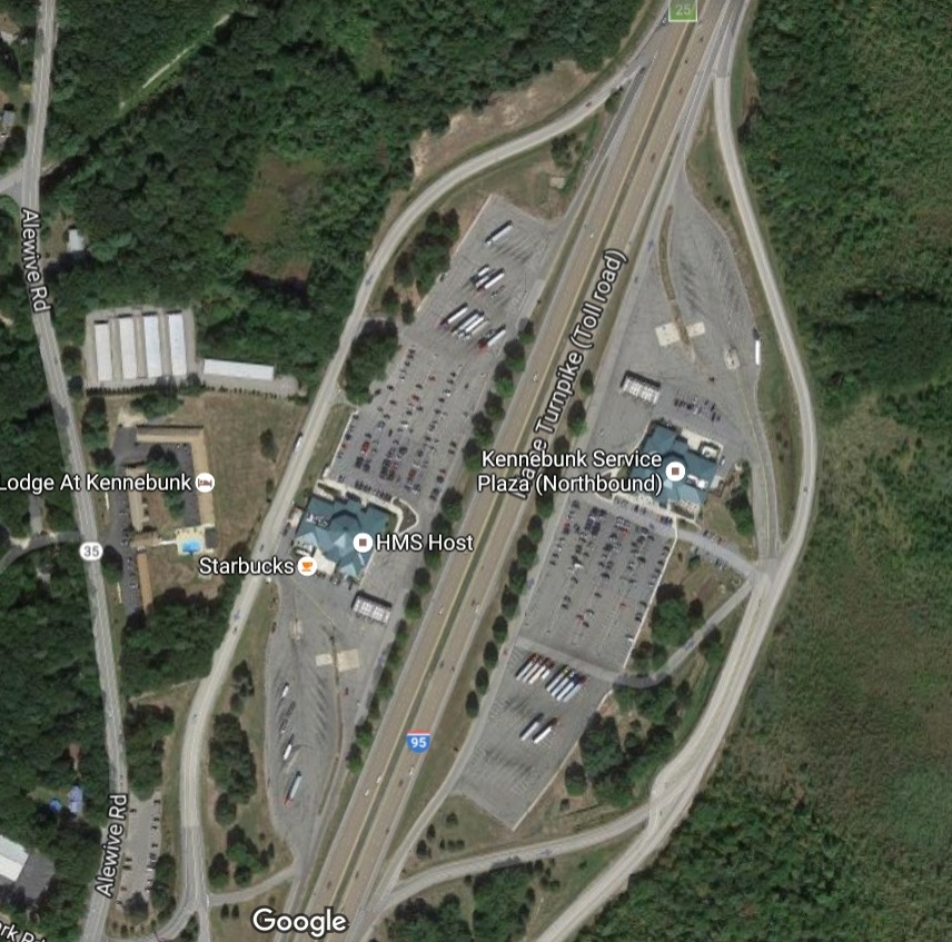 Now the Southbound exit is... weird... but not difficult if you can read. On the right of your pic, ltd - you see the branch that leads to the Kennebunk exit... if you're in the foremost truck parking you have to hit that T, turn hard left, then turn left back into the rest area on the other side of the building to work your way out to 95-S (or you're going to get crucified in K'bunk).