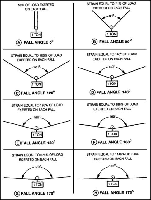 This is for lifting but we are basically doing the same thing just the other way, kinda upside down. Figure A looks closer to what you'd get with the horshoe method, from the eye to the deck at 90° that is. An X chain might be closer to figure E.