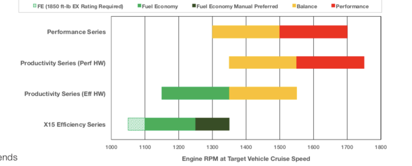 Performance series you can expect to get a fuel economy from that motor itbuild to pull heavy haul higher RPM above 1350 on your high gear doesn’t make a sense you driving lower RPM and try to save fuel. it’s going to take same