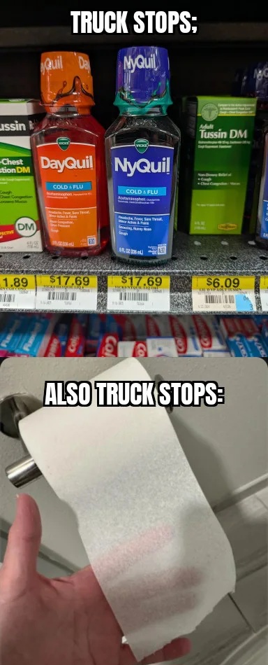 No way that top one is a truckstop with that selection of toothpaste on the second row. Last time I ran out and had to buy toothpaste on the road there was one flavor to choose from at Loves. Lol